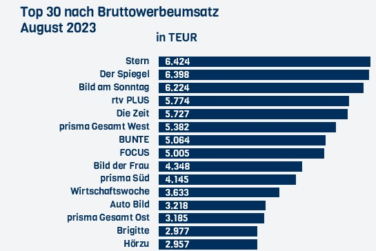 Nielsen-Werbeumsatz August: Unter den freiverkäuflichen Zeitschriften und Wochen-/Sonntagszeitungen haben die beiden Hamburger Magazine mit jeweils…