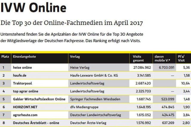 Im Monat April ist bei fast allen Top 30-Onlinenangeboten aus den deutschen Fachmedienhäusern ein leichter Zuwachs der Visits im Vergleich zum Vorjahr…