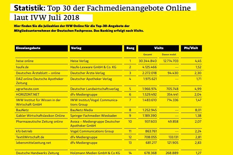 Die Augustzahlen für die Top 30-Onlinenangebote aus den deutschen Fachmedienhäusern zeigen positive Bewegungen auf.
