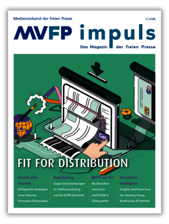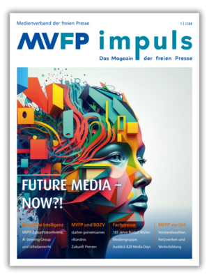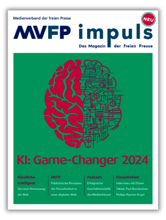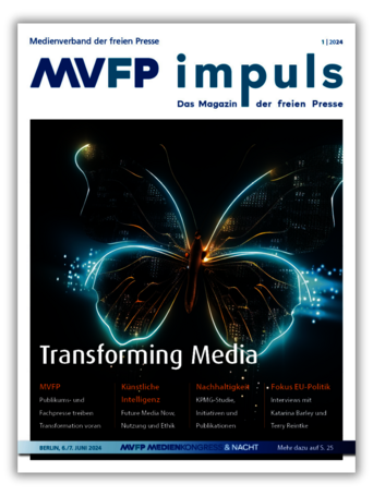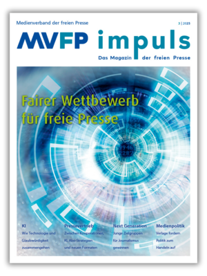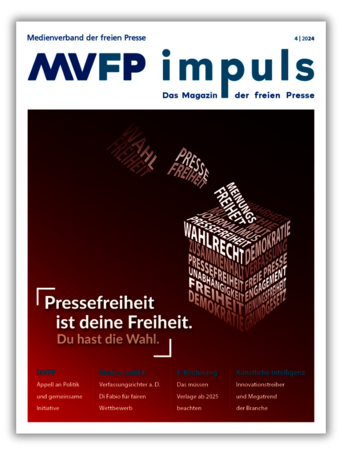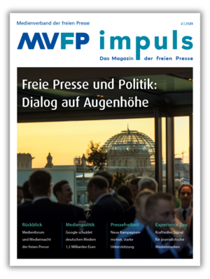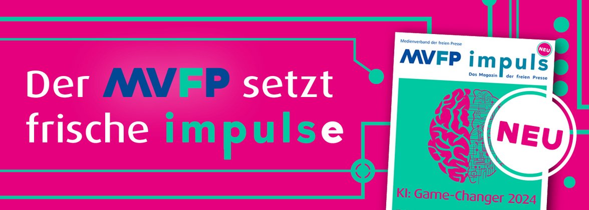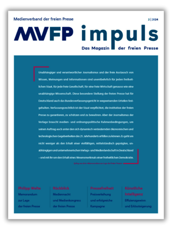 MVFP impuls ist das Branchenmagazin des Medienverbands der freien Presse. Als Aushängeschild des MVFP steht es für die Werte der freien Presse, für Meinungsfreiheit und Pressevielfalt. Mit vier Ausgaben im Jahr stellt die Zeitschrift vor allem jene Menschen in den Mittelpunkt, die die Branche mit Motivation und Engagement voranbringen. Sie bietet praxisnahe, branchenspezifische Inhalte zu aktuellen Entwicklungen, zu medienpolitischen Themen und zu gattungsübergreifenden Trends. MVFP impuls dient als Plattform für Wissenstransfer und erreicht die Top-Entscheiderinnen und -Entscheider der deutschen Verlagswelt sowie zentrale Stakeholder aus Politik, Wirtschaft und Werbung.