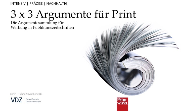 Im Zuge des Website-Relaunches von printwirkt.de hat der VDZ auch seine Argumentesammlung für Werbung in Printmedien überarbeitet und aktualisiert. Ergebnis ist die Präsentation "3x3 Argumente für Print", die auf 35 Charts anschaulich die Stärken von Publikumszeitschriften als Werbemedium darstellt.