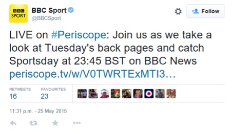 The BBC’s sporting branch (@BBCSport) has utilised Periscope by engaging followers with live sporting reports. But at least for the present, the organisation seems cautious about implementing use of the app across the board – it’s mostly individual reporters using it. Jeremy Vine, for instance, was already trying it out in April, while Ros Atkins used it to report live from a big protest in Athens.
