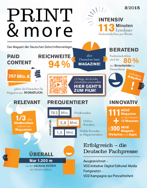 Wussten Sie eigentlich, dass Fachzeitschriften für 80 Prozent der Entscheider in Deutschland der wichtigste Ratgeber sind und mit 113 Minuten Lesedauer pro Woche intensiv genutzt werden? Das wird unter anderem auf dem Cover der heute erschienenen zweiten Ausgabe der PRINT&more 2015 deutlich.