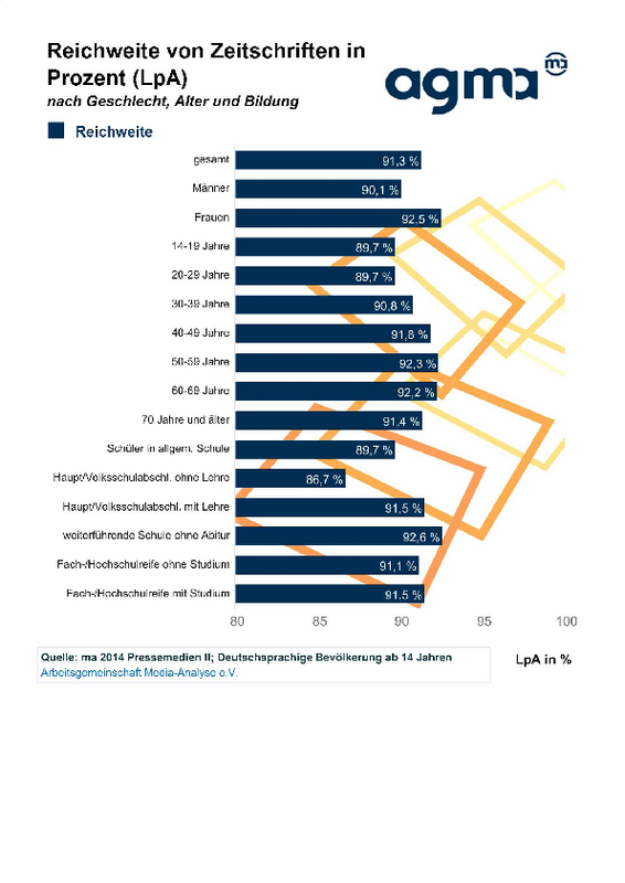 Die Arbeitsgemeinschaft Media-Analyse (agma) veröffentlichte heute die Reichweiten der ma 2014 Pressemedien II. Ausgewiesen werden die Reichweiten von 157 Zeitschriften, drei Zeitung-Supplements sowie die des Lesezirkels.