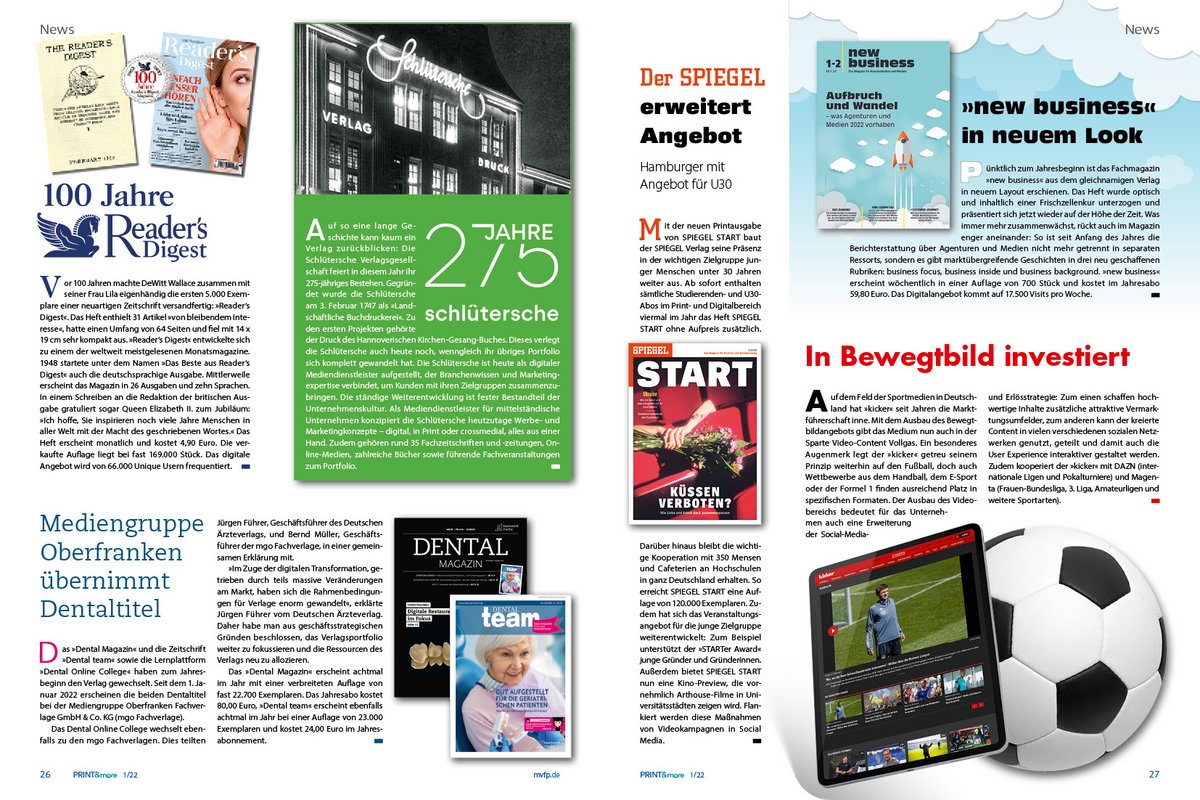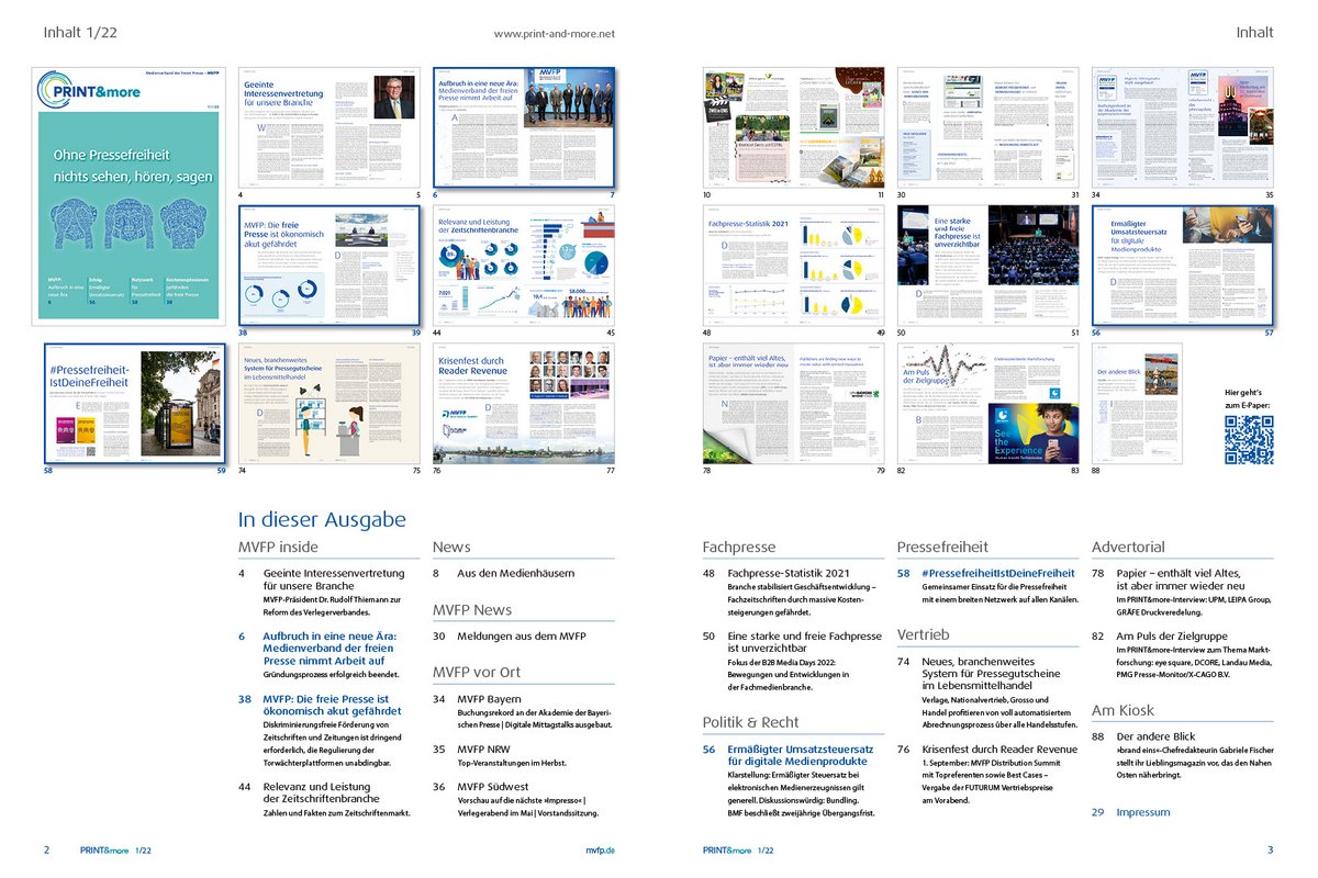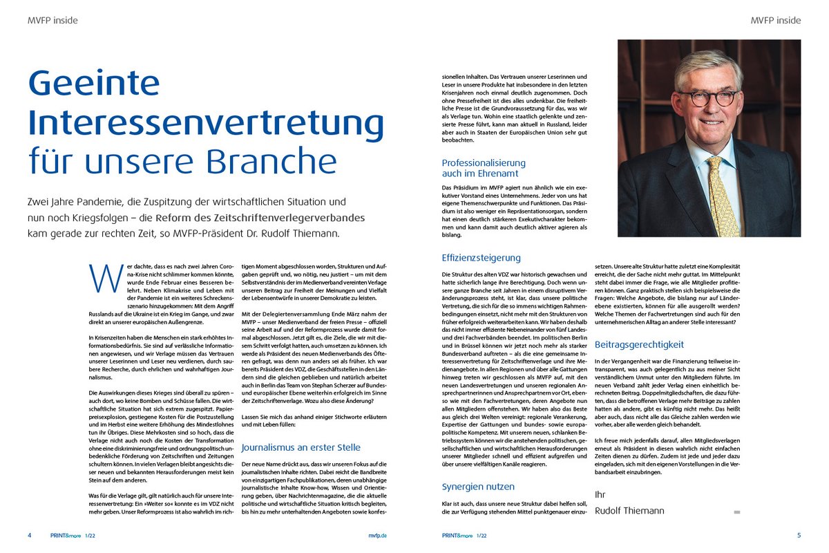 Mit dieser neuen Ausgabe der relaunchten PRINT&more schlägt der MVFP nicht nur eine neue Optik und ein neues Design seines Verbandsmagazins auf, sondern ein neues Kapitel der Interessenvertretung der Zeitschriftenbranche. Der VDZ ist Vergangenheit, seit April agiert der Medienverband der freien Presse als „geeinte Interessenvertretung für unsere Branche“ – so beschreibt es MVFP-PräsidentDr. Rudolf Thiemann in seinem Gastbeitrag in dieser ersten MVFP-Ausgabe. Zwei Jahre Pandemie, eine Zuspitzung der wirtschaftlichen Situation und nun noch Kriegsfolgen, die auch überall dort zu spüren sind, wo keine Bomben und Schüsse fallen – der mehrjährige Reformprozess des Verbandes sei zur richtigen Zeit abgeschlossen worden, so Thiemann. Europa und die demokratische Welt stehen vor enormen Herausforderungen – militärisch, wirtschaftlich, aber auch gesellschaftlich.