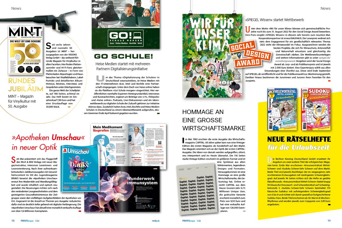 Auf über 20 Seiten stellt die neue PRINT&more mehr als 50 neue Titel, Formate, Initiativen und Web-Auftritte vor, die Ausdruck der Dynamik, Kreativität und Lebendigkeit der Zeitschriftenbranche sind. Die Verlagshäuser beweisen, dass dies auch in wirtschaftlich und politisch schwierigen Zeiten möglich ist. In der Rubrik „Am Kiosk“ stellt ‚brand eins‘-Chefredakteurin Gabriele Fischer ihren persönlichen Lieblingstitel ‚Zenith‘ vor – nachdem ‚brand eins‘ zuvor als erstes Magazin zum dritten Mal in dieser Rubrik als Favorit von anderen Chefredakteurinnen und Chefredakteuren auserkoren wurde. Alle Beiträge auf den insgesamt 88 Seiten illustrieren die Vielfalt und Breite von Markenmedien, die begeistern: Von weltbewegenden Themen über Spezialinteressen bis hin zur Nische, tiefblickend, vorausschauend, sowohl Print als auch Digital, jederzeit kreativ und lesernah.