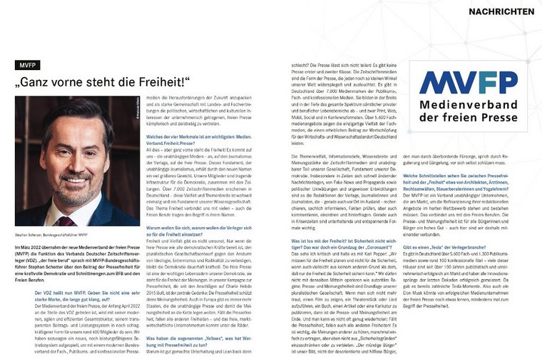 Der Medienverband der freien Presse, der Anfang April 2022 an die Stelle des VDZ getreten ist, wird mit seiner modernen, agilen und effizienten Gesamtstruktur, seinem transparenten Beitrags- und Leistungssystem in noch schlagkräftigerer Form für unsere rund 400 Mitglieder da sein. Wir haben sozusagen ein neues, noch leistungsfähigeres Betriebssystem aufgespielt, um mit einem modernen Bundesverband der Fach-, Publikums- und konfessionellen Pressemedien die Herausforderungen der Zukunft anzupacken und als starke Gemeinschaft mit Landes- und Fachvertretungen die politischen, wirtschaftlichen und kulturellen Interessen der unternehmerisch getragenen, freien Presse kämpferisch und zielstrebig zu vertreten.