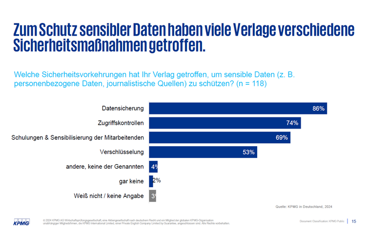 Die meisten Verlage geben einen hohen Reifegrad in den drei Sicherheitskategorien Prävention, Erkennung und Reaktion an. Insgesamt 28 Prozent der befragten Unternehmen können ein detailliertes Konzept für Cybersicherheit vorweisen. Mehr als die Hälfte (56 Prozent) verfügt über ein rund um die Uhr arbeitendes Monitoringsystem für kritische IT-Infrastrukturen und Daten. Ein ähnliches Bild ergibt sich bei der Frage nach spezifischen Sicherheitskonzepten. Insgesamt 28 Prozent der Verlage haben detaillierte Schutzkonzepte mit spezifischen Cybersicherheitsanforderungen für verschiedene Anwendungsfälle entwickelt. Weitere 47 Prozent verfügen noch nicht über solche spezifischen Konzepte, arbeiten aber an maßgeschneiderten Lösungen. Zum Schutz sensibler Daten haben viele Verlage bereits verschiedene Sicherheitsmaßnahmen ergriffen. Besonders verbreitet sind Datensicherung (86 Prozent), Zugangskontrollen (74 Prozent) und Schulungen zur Sensibilisierung der Mitarbeiterinnen und Mitarbeiter (69 Prozent). Dies unterstreicht das Bewusstsein für den Schutz sensibler und vertraulicher Informationen, wie z.B. Nutzerdaten, deren Schutz für die Verlage in der Branche eine hohe Priorität hat. Um die Wirksamkeit der getroffenen Schutzmaßnahmen zu überprüfen, greifen 62 Prozent der Verlage auf externe Dienstleister zurück. 25 Prozent der befragten Verlage führen regelmäßig Penetrationstests durch, 15 Prozent lassen sogenannte GAP-Audits zur Lückenanalyse vornehmen und elf Prozent messen den Security-Status anhand von KPIs.