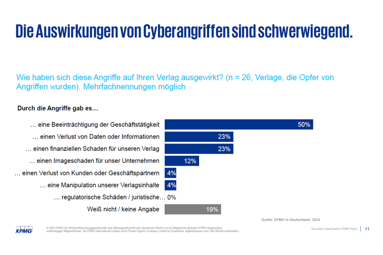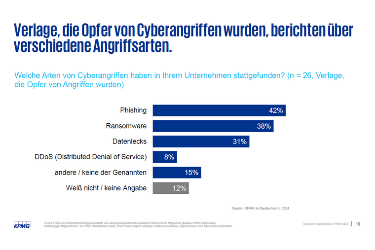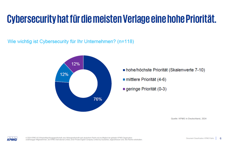 Die Ergebnisse der neuen Studie „Verlagstrends Spezial – Cybersecurity: Wie sich Verlage auf veränderte Bedrohungslagen einstellen“ verdeutlichen die aktuelle Bedrohungslage und unterstreichen die wachsende Sensibilität der Verlage für effektive Sicherheitsmaßnahmen. Die Verlagsstudie wurde durchgeführt vom Medienverband der freien Presse (MVFP) und KPMG in Zusammenarbeit mit Prof. Dr. Thomas Hess von der LMU München und basiert auf einer Befragung von 118 deutschen Verlagshäusern unterschiedlicher Größe und Ausrichtung.