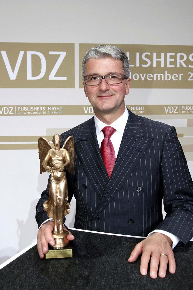 Meine Damen und Herren, das Automobil erfindet sich gerade neu. Unsere Branche steht vor dem größten technologischen Wandel. Was uns bei allem Wettbewerb und unterschiedlichen Konzepten eint, ist die Entschlossenheit, nachhaltige Lösungen für individuelle Mobilität der Zukunft zu schaffen. Wenn es diese Geisteshaltung des langfristigen Handelns ist, – Ökonomie, Ökologie und gesellschaftliche Verantwortung im harmonischen Dreiklang – dann nehmen wir den Preis gerne an. Wenn es diese Haltung ist, die einem innovativen Unternehmen heute die Victoria beschert, dann freut uns das in einem Konzern mit vier Traditions-Marken – Audi, Lamborghini, Ducati und Italdesign – heute abend ganz besonders. Victoria heißt Sieg – und den müssen wir uns jeden Tag aufs Neue erarbeiten. Sie, verehrte Verleger, setzen die Messlatte für Audi mit dieser Auszeichnung noch höher. Auch dafür spreche ich Ihnen heute Abend meinen herzlichen Dank aus!