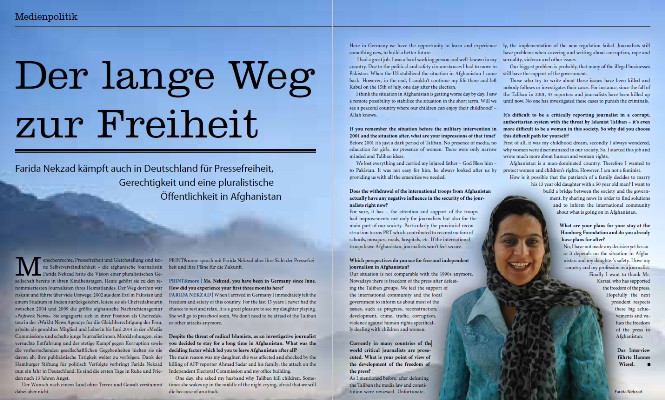 Journalistin Farida Nekzad hatte die Vision einer pluralistischen Gesellschaft bereits in ihren Kindheitstagen. Heute gehört sie zu den renommiertesten Journalisten ihres Heimatlandes. Der Weg dorthin war riskant und führte über viele Umwege: 2002 aus dem Exil in Pakistan und einem Studium in Indien zurückgekehrt, leitete sie als Chefredakteurin zwischen 2004 und 2009 die größte afghanische Nachrichtenagentur "Pajhwok News". Sie engagierte sich in ihrer Position als Chefredakteurin der "Wakht News Agency" für die Gleichberechtigung der Frau, arbeite als gewähltes Mitglied und Leiterin bis Juni 2014 in der "Media Commission" und schulte junge Journalistinnen. Morddrohungen, eine versuchte Entführung und der stetige Kampf gegen Korruption sowie die vorherrschenden gesellschaftlichen Gegebenheiten hielten sie nie davon ab, ihre publizistische Tätigkeit weiter zu verfolgen. Dank der Hamburger Stiftung für politisch Verfolgte verbringt Farida Nekzad nun ein Jahr in Deutschland. Es sind die ersten Tage in Ruhe und Frieden nach 13 Jahren Angst.