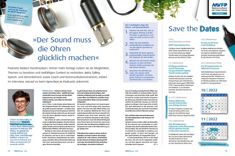 Podcasts bleiben Trendmedium. Immer mehr Verlage nutzen sie als Möglichkeit, Themen zu besetzen und vielfältigen Content zu verbreiten. Jutta Talley, Sprech- und Stimmlehrerin sowie Coach und Kommunikationstrainerin, erklärt im Interview, worauf es beim Sprechen in Podcasts ankommt.