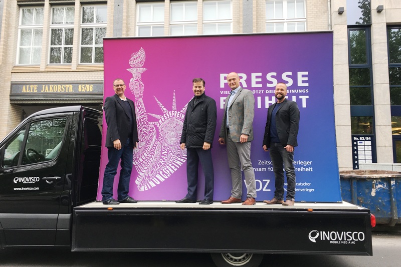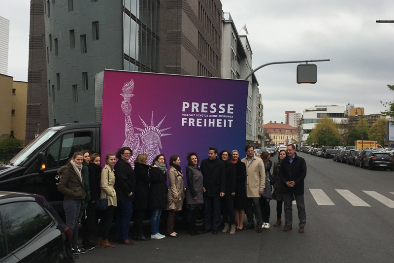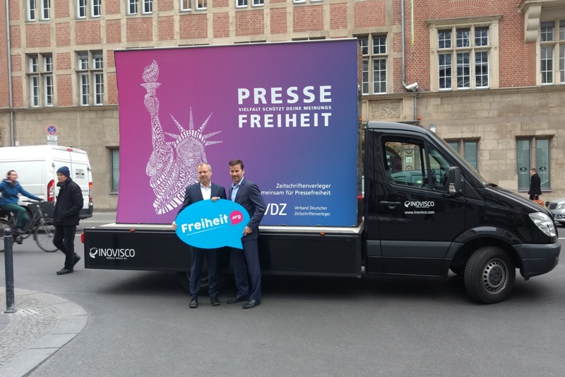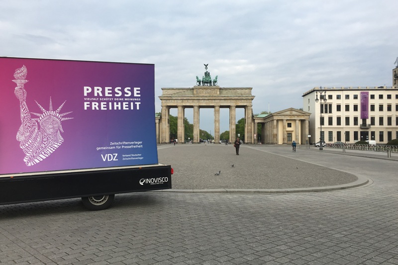 Vor dem aktuellen Hintergrund der weltweit zunehmenden Restriktionen der Pressefreiheit kommt dem morgigen Internationalen Tag der Pressefreiheit auch in diesem Jahr eine noch höhere Bedeutung zu. Der VDZ macht es sich heute zur Aufgabe, mit dem neuen Anzeigenmotiv dieses Thema in das Bewusstsein der Menschen zu bringen und auf die weltweiten Missstände, auch bei uns, aufmerksam zu machen. Dazu ist der VDZ on tour, quer durch Berlin mit verschiedenen Stopps, unter anderem bei der Friedrich-Naumann-Stiftung, dpa, Axel Springer, Egmont Ehapa Media, FUNKE, Reporter ohne Grenzen, Cicero, Hubert Burda Media und SPIEGEL, aber auch am Brandenburger Tor.