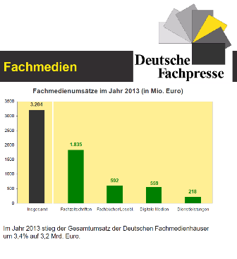 Deutsche Fachmedienhäuser kennen ihre Kunden ganz genau. Die erfolgreiche Erfüllung ihrer Bedürfnisse und die Berücksichtigung der aktuellen Marktentwicklungen schlagen sich in einem breiten Produktportfolio nieder. Mit einem starken Plus von 3,4 Prozent wuchs der Umsatz der Fachmedienbranche in 2013 gegenüber 2012 auf insgesamt 3,2 Milliarden Euro. Damit konnten die Fachverlage die positive Umsatzsteigerung des Vorjahres (2012: +0,4 Prozent) weiter fortsetzen. Insbesondere Fachzeitschriften konnten deutlich zulegen, sowohl bei den Anzeigen- als auch bei den Vertriebserlösen. Mit einem Plus von 31 Millionen Euro leisten die Anzeigenumsätze den größten Einzelbeitrag zum Wachstum. Weitere Umsatztreiber sind die Vertriebsumsätze digitaler Medien und merkliche Zuwächse im Eventgeschäft.