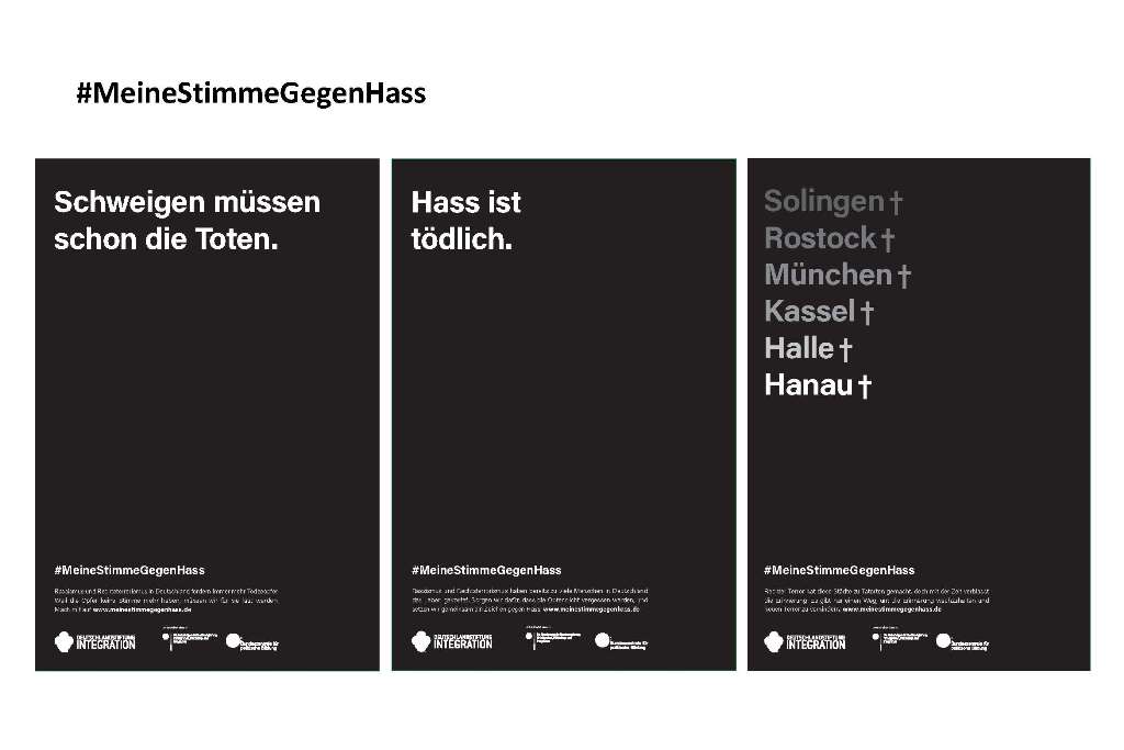Die Deutschlandstiftung Integration hat am 7. Oktober die Initiative #MeineStimmeGegenHass gestartet, die dazu aufruft, Haltung gegen Rassismus und Rechtsterrorismus zu zeigen. Sie wird gefördert durch die Beauftragte der Bundesregierung für Migration, Flüchtlinge und Integration, Staatsministerin Annette Widmann-Mauz und die Bundeszentrale für politische Bildung und wird vom Deutschen Fußball-Bund aktiv unterstützt. Mit bundesweiten Plakaten und Anzeigen, einem Fernseh-Spot, der Webseite www.meinestimmegegenhass.de und Social Media-Aktionen wird unter #MeineStimmeGegenHass die Botschaft der Initiative verbreitet sowie zum Mitmachen aufgerufen.