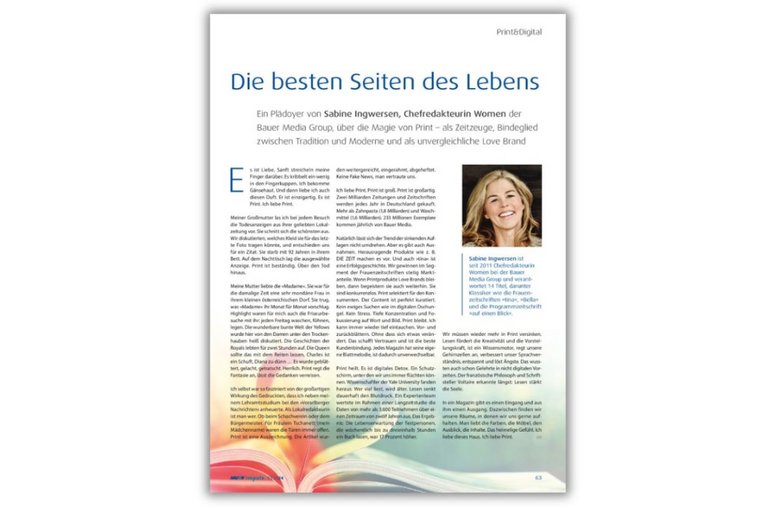 Natürlich lässt sich der Trend der sinkenden Auflagen nicht umdrehen. Aber es gibt auch Ausnahmen. Herausragende Produkte wie z. B. DIE ZEIT machen es vor. Und auch »tina« ist eine Erfolgsgeschichte. Wir gewinnen im Segment der Frauenzeitschriften stetig Marktanteile. Wenn Printprodukte Love Brands bleiben, dann begeistern sie auch weiterhin. Sie sind konkurrenzlos. Print selektiert für den Konsumenten. Der Content ist perfekt kuratiert. Kein ewiges Suchen wie im digitalen Dschungel. Kein Stress. Tiefe Konzentration und Fokussierung auf Wort und Bild. Print bleibt. Ich kann immer wieder tief eintauchen. Vor- und zurückblättern. Ohne dass sich etwas verändert. Das schafft Vertrauen und ist die beste Kundenbindung. Jedes Magazin hat seine eigene Blattmelodie, ist dadurch unverwechselbar.