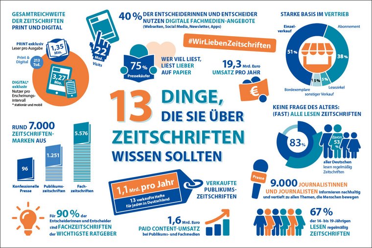 Hätten Sie es gewusst: Über 80 Prozent der Deutschen lesen regelmäßig Zeitschriften. Kein Wunder, denn mit knapp 7.000 Medienmarken ist die deutsche Zeitschriftenlandschaft eine der vielfältigsten weltweit.