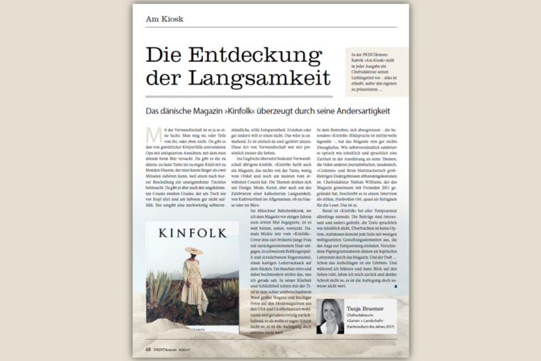 Banal ist Kinfolk bei aller Tempoarmut allerdings niemals. Die Beiträge sind interessant und anders gedreht, die Texte sprachlich wie inhaltlich dicht. Überfrachten ist keine Option, stattdessen kommt jede Seite mit wenigen wohlgesetzten Gestaltungselementen aus, die das Auge zur Entspannung einladen. Verschiedene Papier-Grammaturen dienen als haptisches Leitsystem durch das Magazin. Und der Duft ... Schon das Aufschlagen ist ein Erlebnis. Und während ich blättere und mein Blick auf den Seiten ruht, lehne ich mich zurück und denke: Schreit nicht so, es ist die Aufregung doch sowieso nicht wert.