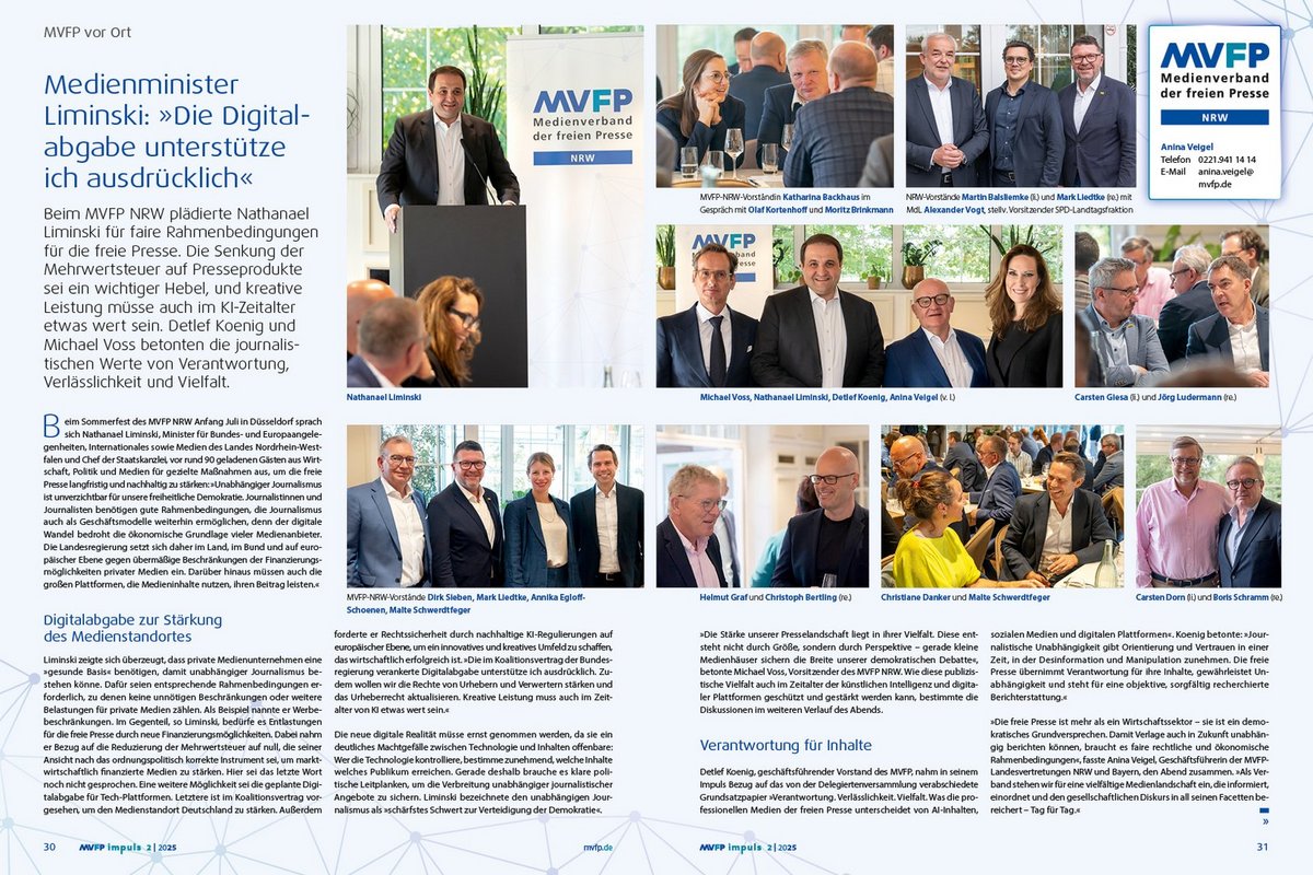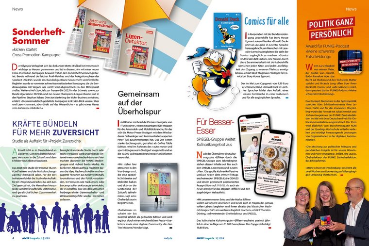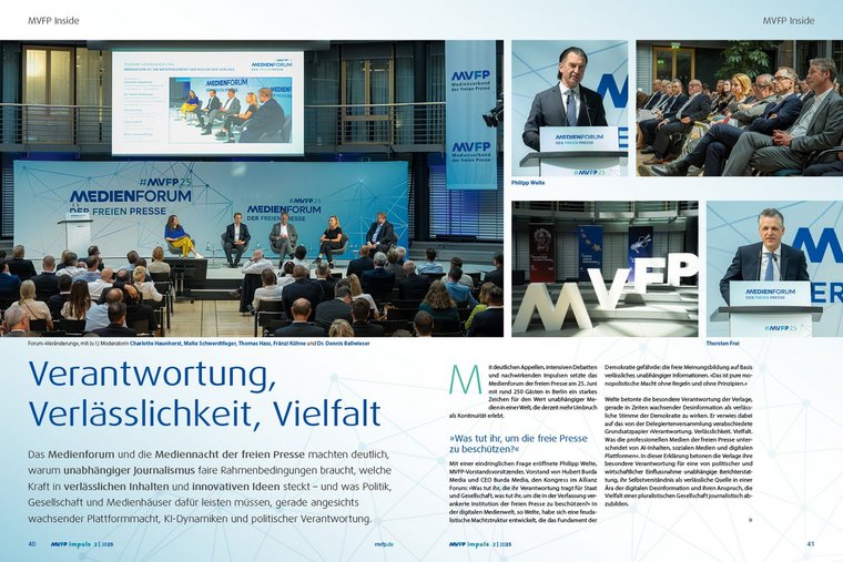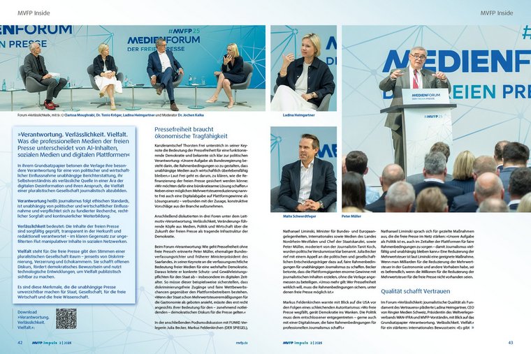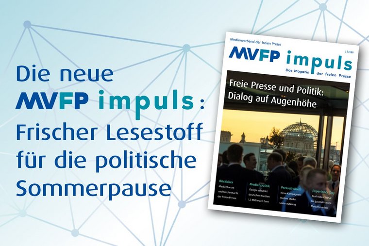 MVFP impuls erscheint gedruckt und digital als E-Paper und liefert die relevanten Themen, Köpfe und Perspektiven, die die Medienbranche bewegen.