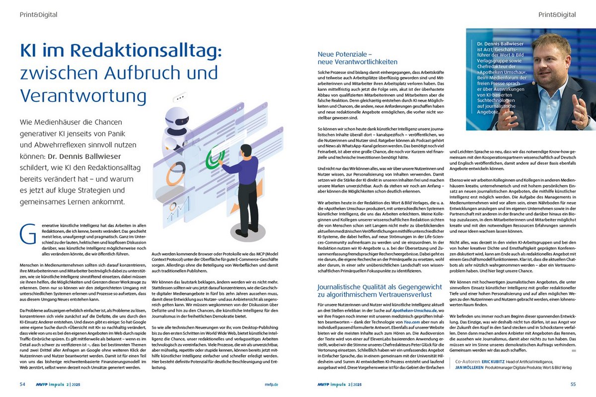 Genauso steht die Rolle von künstlicher Intelligenz im Fokus der Debatten und damit im Fokus dieser Ausgabe. „KI darf kein Einfallstor für neue Abhängigkeitsverhältnisse werden. Sie muss der freien Presse dienen – nicht umgekehrt“, mahnte SPIEGEL-Geschäftsführer Thomas Hass beim Medienforum der freien Presse. Dr. Dennis Ballwieser, Geschäftsführer beim Wort & Bild Verlag und Chefredakteur der „Apotheken Umschau“, beschreibt in seinem Gastbeitrag, wie Medienhäuser die Chancen generativer KI jenseits von Panik und Abwehrreflexen sinnvoll nutzen können und warum es jetzt auf kluge Strategien und gemeinsames Lernen ankommt. Besorgniserregend ist dabei, dass über 60 Prozent aller KI-generierten Google-Suchergebnisse zu keinem einzigen Klick auf Medienangebote führen (S. 54).