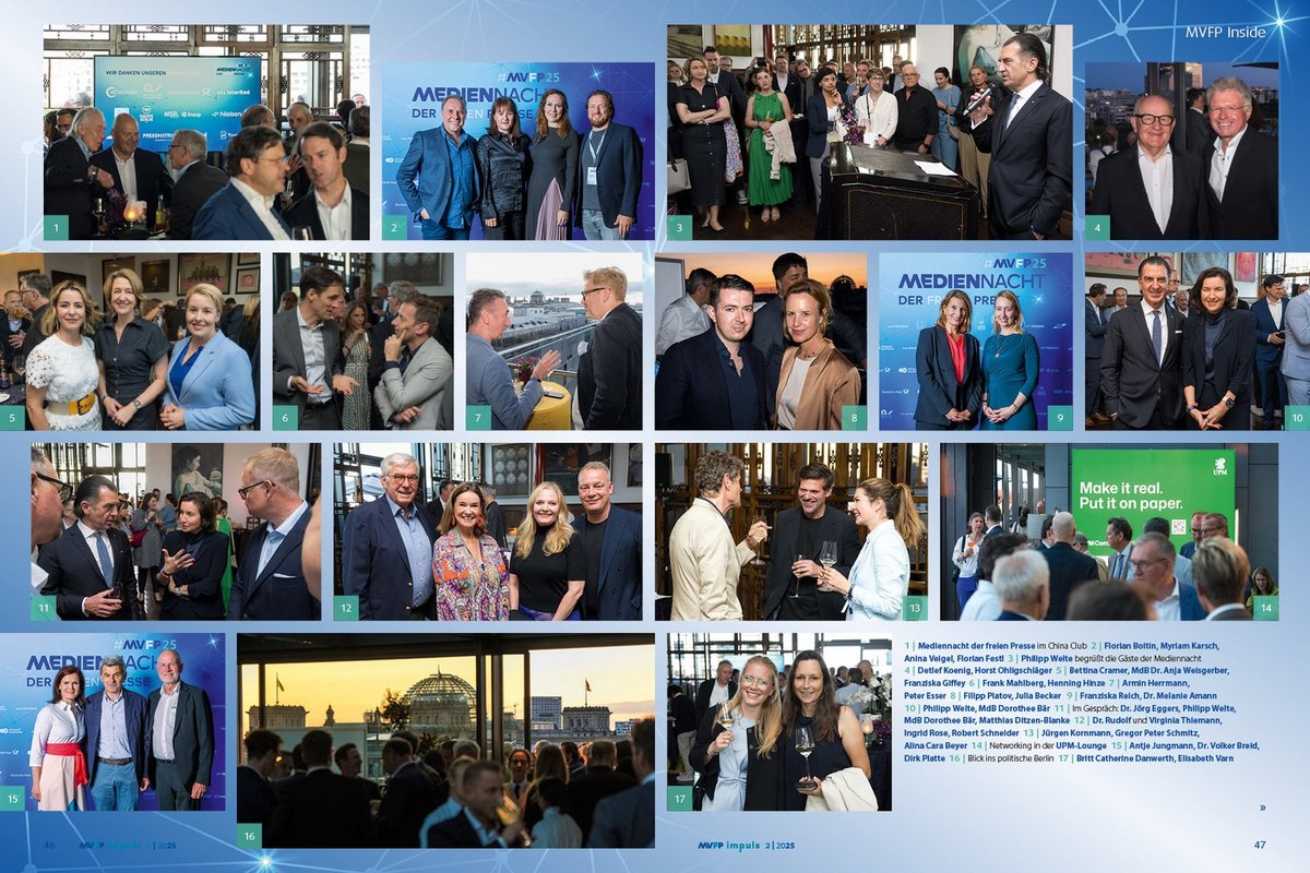 Das Branchenmagazin blickt auf das Medienforum und die Mediennacht der freien Presse zurück. Beide Veranstaltungen setzten erfolgreiche Akzente im Dialog zwischen den Medienhäusern und den politischen Entscheidungsträgern. 250 Gäste diskutierten im Allianz Forum und 350 Gäste beim anschließenden Empfang im China Club über die Bedingungen für unabhängigen Journalismus – vor dem Hintergrund wachsender Plattformmacht, gesellschaftlicher Verantwortung und technologischer Umbrüche (S. 40).