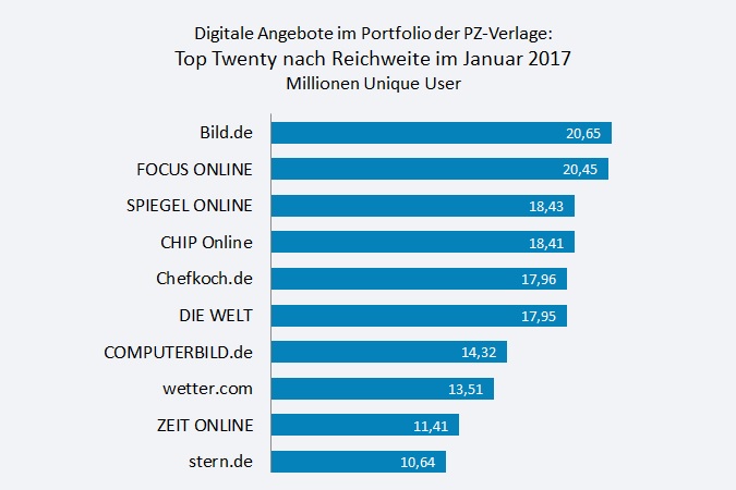 Im Januar 2017 sind die Digitalangebote der PZ-Verlage weiterhin auf Wachstumskurs. Wie „Die Welt“ den Abstand auf „Spiegel online“ verkürzen kann und welche Nachrichtenangebote im Vorjahresvergleich die Nase weit vorn hatten, lesen Sie hier.