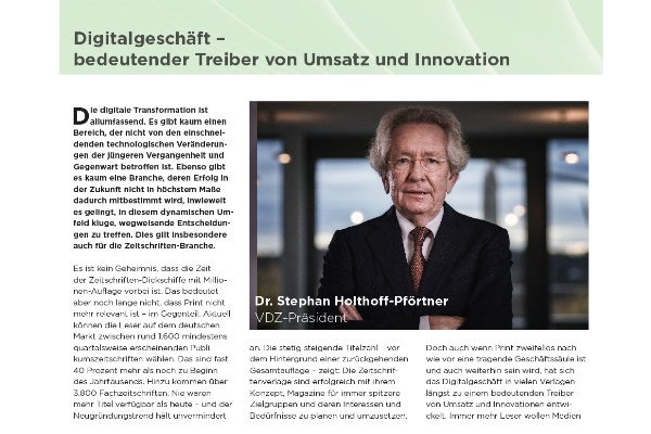 Die digitale Transformation ist allumfassend. Es gibt kaum einen Bereich, der nicht von den einschneidenden technologischen Veränderungen der jüngeren Vergangenheit und Gegenwart betroffen ist. Ebenso gibt es kaum eine Branche, deren Erfolg in der Zukunft nicht in höchstem Maße dadurch mitbestimmt wird, inwieweit es gelingt, in diesem dynamischen Umfeld kluge, wegweisende Entscheidungen zu treffen. Dies gilt insbesondere auch für die Zeitschriften-Branche.