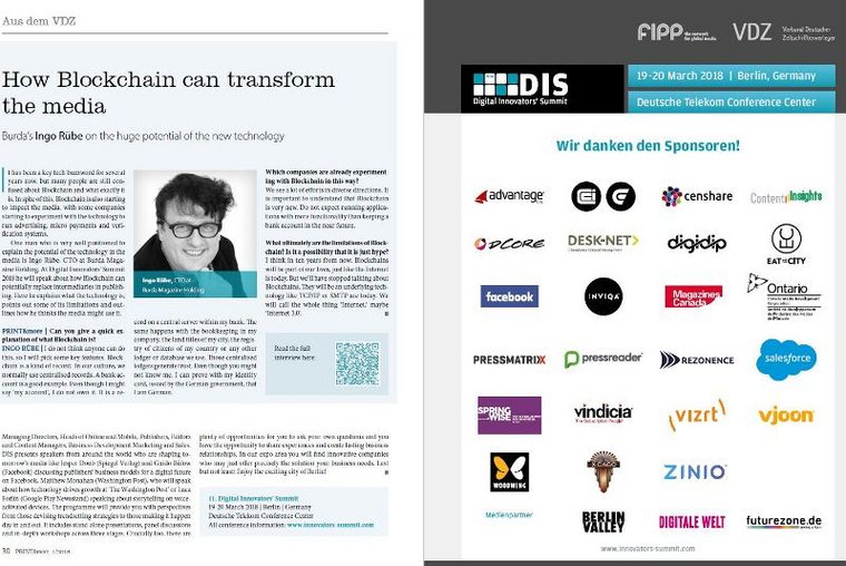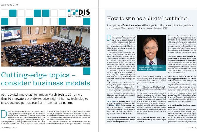 That’s why FIPP and VDZ’s Digital Innovators’ Summit (DIS), held in Berlin on 19-20 March, is a must for anyone in the B2C and B2B media industries. It is the place to hear about the future of media and technology directly from the innovators who are driving change. DIS brings together senior executives from media businesses, technology innovators and solution providers to share ideas, discuss emerging trends and showcase future products.
