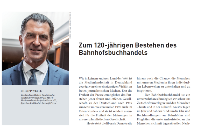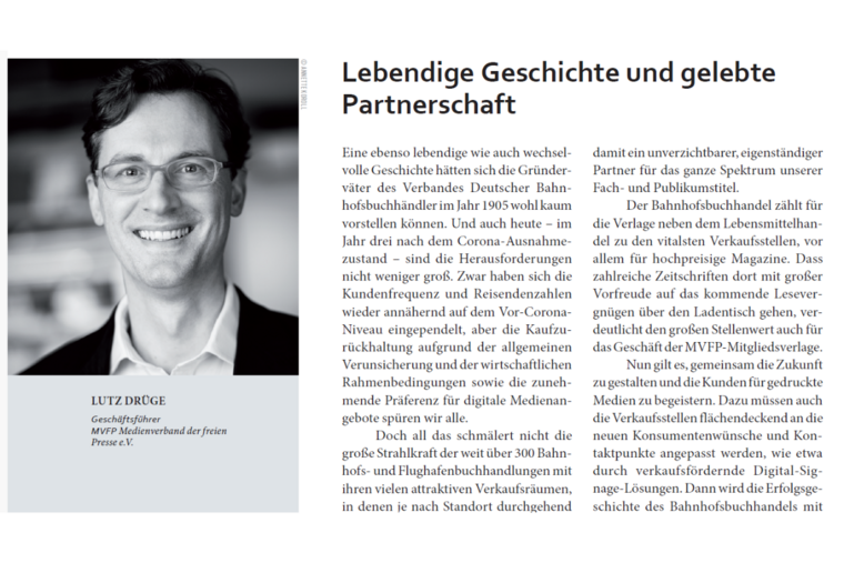 „Eine ebenso lebendige wie auch wechselvolle Geschichte hätten sich die Gründerväter des Verbandes Deutscher Bahnhofsbuchhändler im Jahr 1905 wohl kaum vorstellen können. Und auch heute – im Jahr drei nach dem Corona-Ausnahmezustand – sind die Herausforderungen nicht weniger groß. Zwar haben sich die