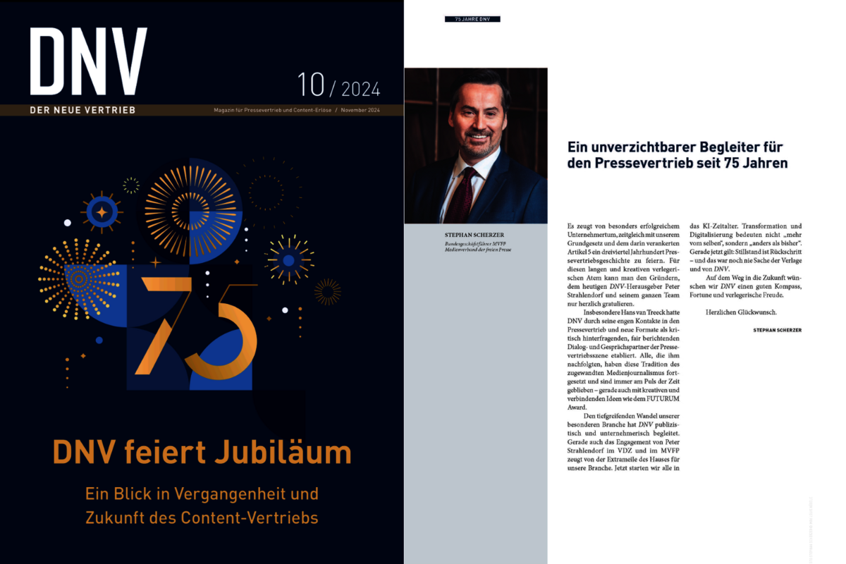 Es zeugt von besonders erfolgreichem Unternehmertum, zeitgleich mit unserem Grundgesetz und dem darin verankerten Artikel 5 ein dreiviertel Jahrhundert Pressevertriebsgeschichte zu feiern. Für diesen langen und kreativen verlegerischen Atem kann man den Gründern, dem heutigen DNV-Herausgeber Peter Strahlendorf und seinem ganzen Team nur herzlich gratulieren.
