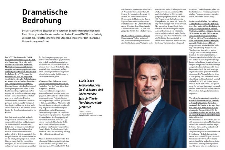Das aktuelle Bedrohungsszenario für einzelne Titel und ganze Verlage ist noch dramatischer als im Erhebungszeitraum 2021, als weder das Ausmaß der Mindestlohnerhöhung in 2022 noch die jüngste Papierpreisexplosion um bis zu 150 Prozent sowie die Explosion der Energiekosten um bis zu 380 Prozent für importiertes Erdgas vorhersehbar waren. Nur wenn diese Kosten für die Zeitschriften diskriminierungsfrei abgefedert werden, können wir einen nicht wieder zu behebenden Schaden für die Meinungs- und Pressevielfalt und damit die Vielfalt der Lebensentwürfe in Deutschland abwenden und die herausfordernde Transformation erfolgreich fortsetzen. Das Koalitionsvorhaben, die flächendeckende Versorgung mit periodischen Presseerzeugnissen zu gewährleisten, ist deshalb absolut nötig.
