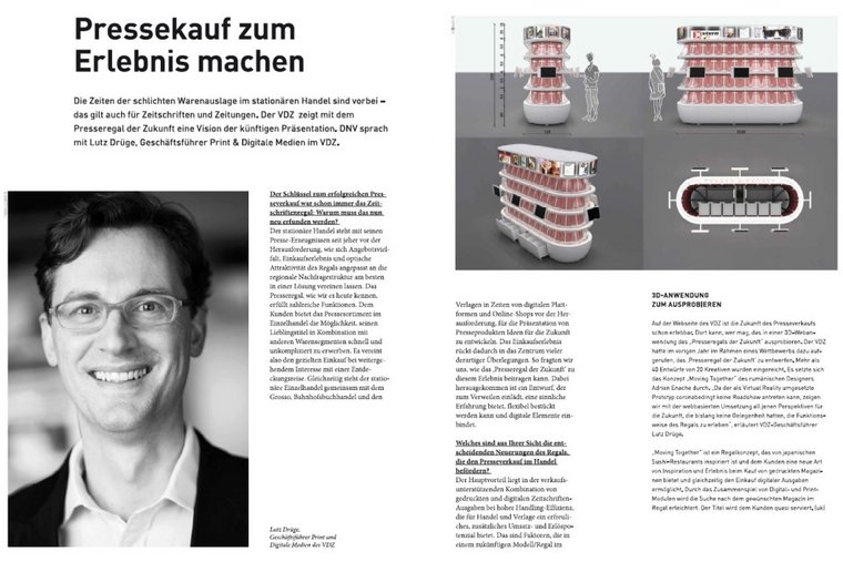 Die Zeiten der schlichten Warenauslage im stationären Handel sind vorbei – das gilt auch für Zeitschriften und Zeitungen. Der VDZ zeigt mit dem Presseregal der Zukunft eine Vision der künftigen Präsentation. DNV sprach mit Lutz Drüge, Geschäftsführer Print & Digitale Medien im VDZ.