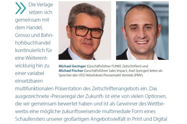 „Die Verlage setzen sich gemeinsam mit dem Handel, Grosso und Bahnhofsbuchhandel kontinuierlich für eine Weiterentwicklung hin zu einer variabel einsetzbaren multifunktionalen Präsentation des Zeitschriftenangebots ein. Das ausgezeichnete ‚Presseregal der Zukunft‘ ist eine von vielen Optionen, die wir gemeinsam bewertet haben und ist als Gewinner des Wettbewerbs eine mögliche zukunftsweisende multimediale Form eines Schaufensters unserer großartigen Angebotsvielfalt in Print und Digital.“