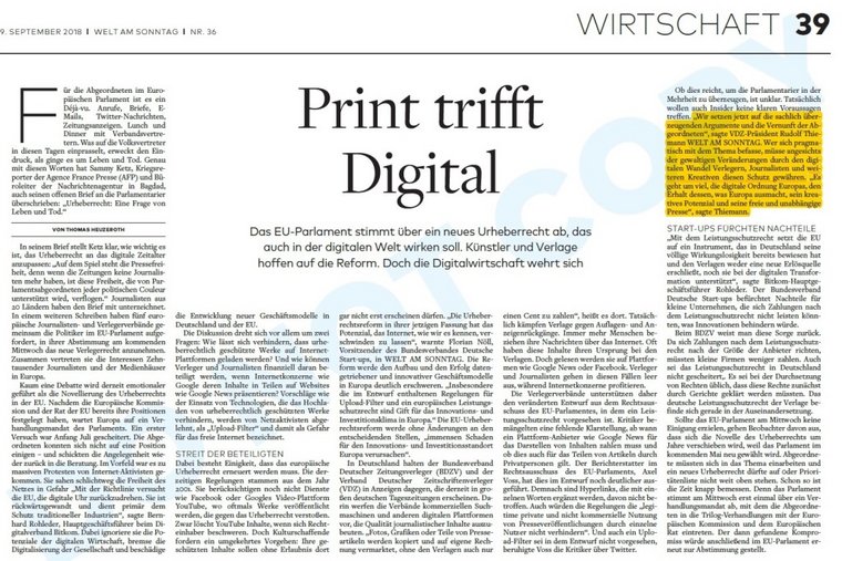 Dr. Rudolf Thiemann: „Wir setzen auf die sachlich überzeugenden Argumente und die Vernunft der Abgeordneten. Wer sich pragmatisch mit dem Thema befasst, muss angesichts der gewaltigen Veränderungen durch den digitalen Wandel Verlegern, Journalisten und weiteren Kreativen diesen Schutz gewähren. Es geht um viel – die digitale Ordnung Europas, den Erhalt dessen, was Europa ausmacht – sein kreatives Potential und seine freie und unabhängige Presse.“