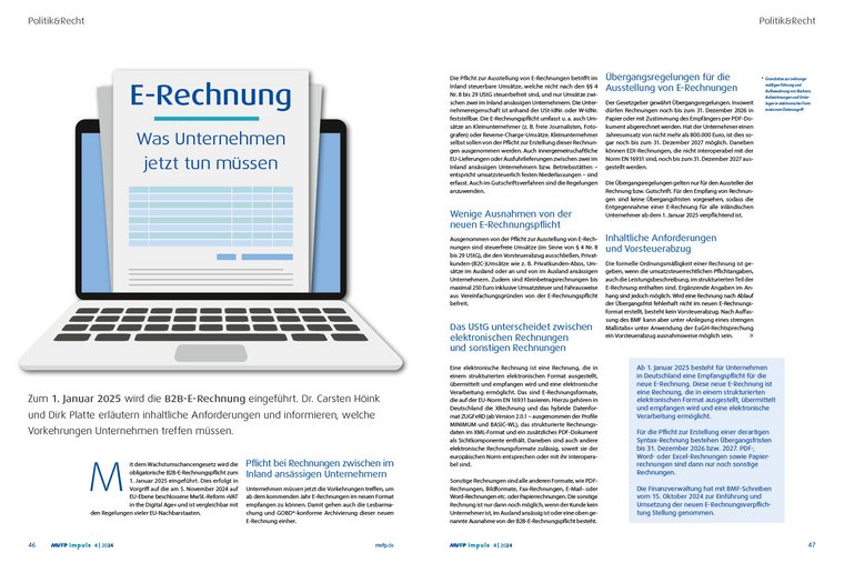 Mit dem Wachstumschancengeseetz wird die obligatorische B2B-E-Rechnungspflicht zum 1. Januar 2025 eingeführt. Dies erfolgt in Vorgriff auf die am 5. November 2024 auf EU-Ebene beschlossene MwSt.-Reform »VAT in the Digital Age« und ist vergleichbar mit den Regelungen vieler EU-Nachbarstaaten.