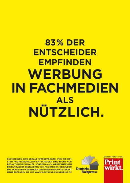 Zeitschriften sind ideale Werbeträger – das ist die Kernbotschaft der aufmerksamkeitsstarken Print-wirkt-Kampagne des VDZ. Dass speziell auch Fachmedien "wirken", beweist wiederum die aktuelle Entscheideranalyse der Deutschen Fachpresse, so etwa eine der Kernaussagen: 83 Prozent der Entscheider empfinden Werbung in Fachmedien als nützlich. In gemeinsamer Kooperation wurden nun beide Verbandsaktivtäten fruchtbar zusammengebracht: Angereichert mit den Ergebnissen der B2B-Entscheideranalyse 2014/15 wurden drei wirksame Anzeigenmotive entwickelt, die die Vorteile von Fachmedien in den Mittelpunkt stellen. Die Anzeigenmotive können auf der Website der Deutschen Fachpresse heruntergeladen und kostenlos in allen Medien verbreitet werden. Alle Anzeigenmotive und weitere Informationen hier.