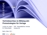 „Der Vertriebserlös hat an Bedeutung für die Zeitschriftenverlage zugenommen“, so Ludwig von Jagow, Geschäftsführer Vertrieb im VDZ. „Dadurch rücken bislang eher vernachlässigte Fragen der Preisstrategien für den Print- und ePublishing-Vertrieb in den Vordergrund; viele Verlage suchen hier Maßstäbe und Orientierung.“ Diese gibt die neue Studie „Vertriebserlöse im Mittelpunkt -Preisstrategien für Verlage“, die der VDZ in Kooperation mit der Vocatus AG jetzt veröffentlicht. Sie ist Grundlage und Unterstützung für eine systematische und nachhaltige Preisfindung und Preissetzung im Pressevertrieb.
