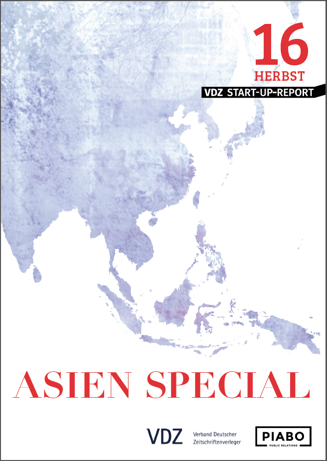 Der Bericht ASIEN SPECIAL erscheint zum ersten Mal in Oktober 2016 im Rahmen des VDZ Start-Up Reports und ist eine Zusammenarbeit des Verbandes Deutscher Zeitschriftenverleger e.V. mit der PIABO Medienmanagement GmbH. Der VDZ Start-up Report wird Verbandsmitgliedern des VDZ kostenfrei zur Verfügung gestellt. Alle anderen Interessenten können den Report für 224 Euro p.a. zzgl. MwSt. bei Anja Mumm unter a.mumm(at)vdz.de bestellen.