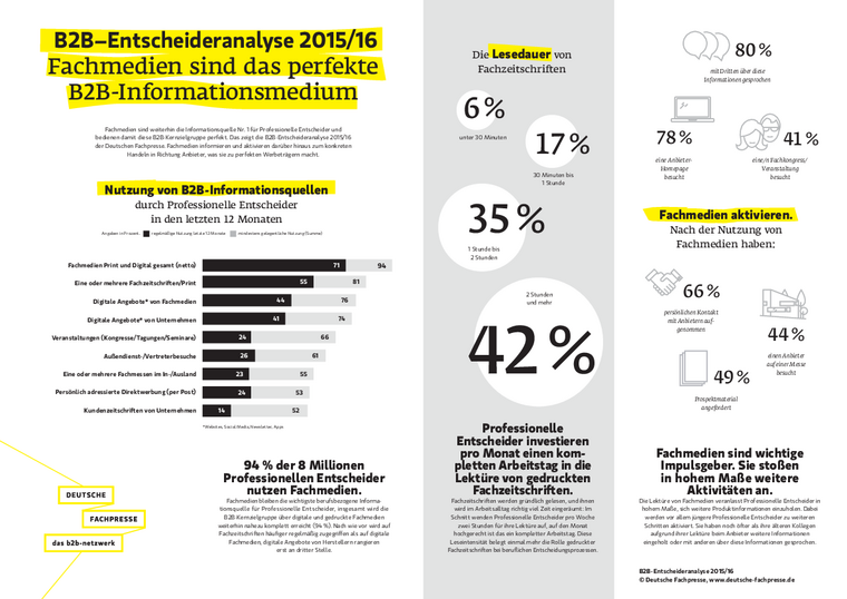 Die B2B-Entscheideranalyse untersucht das Informationsverhalten und die Mediennutzung professioneller Entscheider in Deutschland. Die Studie 2015/16 wurde von der Czaia Marktforschung GmbH (Bremen) im Auftrag der Deutschen Fachpresse durchgeführt. Hierfür wurden vom 4. August bis 12. September 2014 sowie vom 12. August bis 23. September 2015 insgesamt 607 professionelle Entscheider telefonisch befragt. Die Interviews der Stichprobe repräsentieren 8 Millionen professionelle Entscheider. Grundlage der Hochrechnung bildet der Mikrozensus der Jahre 2011/14. Als „professionelle Entscheider“ werden Selbständige oder Freiberufler definiert sowie Meister/Poliere als Angestellte sowie Angestellte mit selbständigen, (begrenzt) verantwortlichen Tätigkeiten bzw. mit Führungsaufgaben und Entscheidungsbefugnissen, die ein persönliches Netto-Einkommen von mindestens 2.300 Euro pro Monat haben.