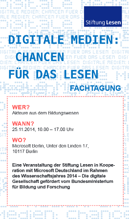Am 25. November 2014 findet die Fachtagung Digitale Medien: Chancen für das Lesen bei Microsoft in Berlin statt, die von der Stiftung Lesen in Kooperation mit Microsoft Deutschland im Rahmen des Wissenschaftsjahres 2014 — Die Digitale Gesellschaft, gefördert vom Bundesministerium für Bildung und Forschung, veranstaltet wird.
