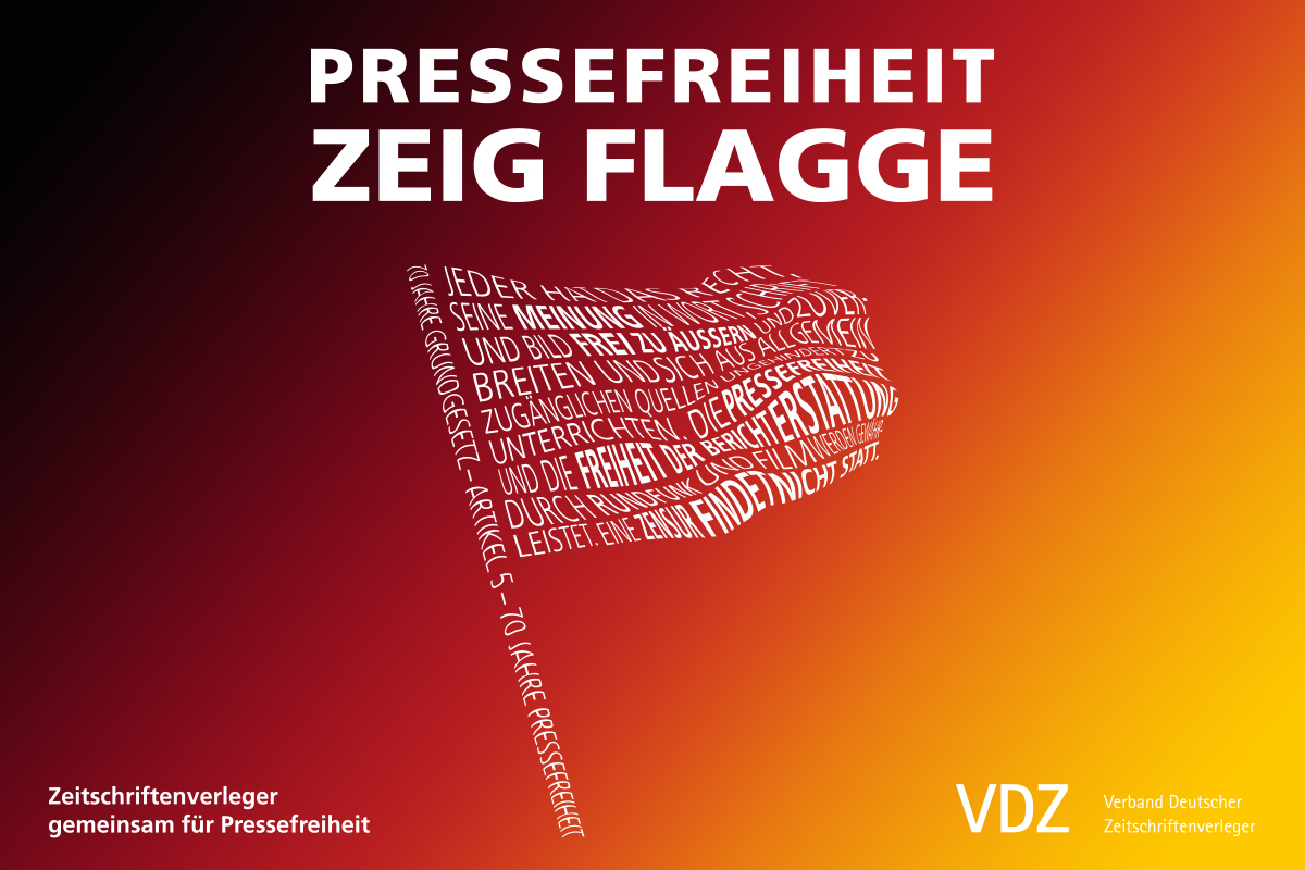 Seit dem Anschlag auf die Redaktion in Paris läuft die Kampagne des VDZ zur Presse- und Meinungsfreiheit. Das aktuelle Motiv ist vom Jubiläum des Grundgesetzes inspiriert, dem Fundament unserer freiheitlichen demokratischen Grundordnung, und richtet sich an alle, die sich Pressefreiheit auf die Fahne schreiben. Gemeinsam „Flagge zeigen“ ist wichtig, damit Verlage und Redaktionen nicht zum Schweigen gebracht werden können, sei es durch organisierte Kriminalität, religiösen Fanatismus oder auch linken und rechten Extremismus.