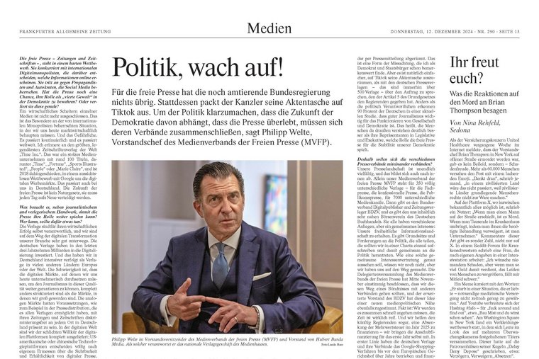 „Für die freie Presse hat die noch amtierende Bundesregierung nichts übrig. Stattdessen packt der Kanzler seine Aktentasche auf Tiktok aus. Um der Politik klarzumachen, dass die Zukunft der Demokratie davon abhängt, dass die Presse überlebt, müssen sich deren Verbände zusammenschließen, sagt Philipp Welte, Vorstandschef des Medienverbands der freien Presse (MVFP).“
