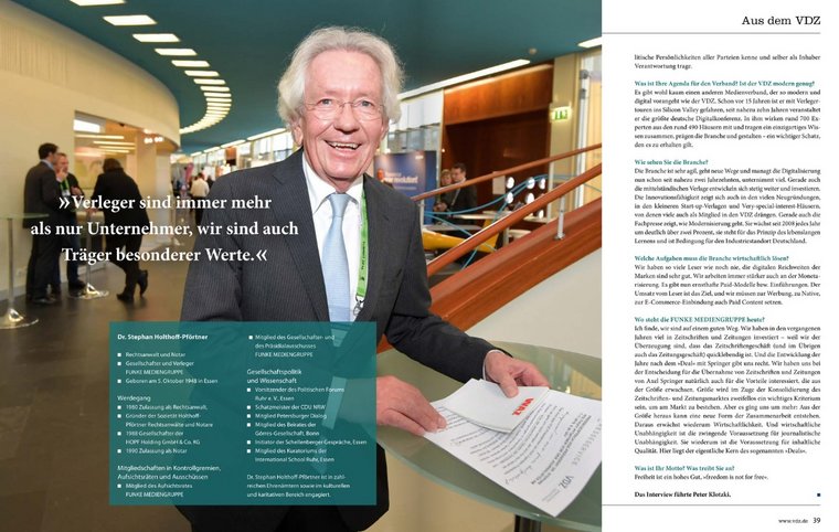Die Branche ist sehr agil, geht neue Wege und managt die Digitalisierung nun schon seit nahezu zwei Jahrzehnten, unternimmt viel. Gerade auch die mittelständischen Verlage entwickeln sich stetig weiter und investieren. Die Innovationsfähigkeit zeigt sich auch in den vielen Neugründungen, in den kleineren Start-up-Verlagen und Very-special-interest-Häusern, von denen viele auch als Mitglied in den VDZ drängen. Gerade auch die Fachpresse zeigt, wie Modernisierung geht. Sie wächst seit 2008 jedes Jahr um deutlich über zwei Prozent, sie steht für das Prinzip des lebenslangen Lernens und ist Bedingung für den Industriestandort Deutschland.
