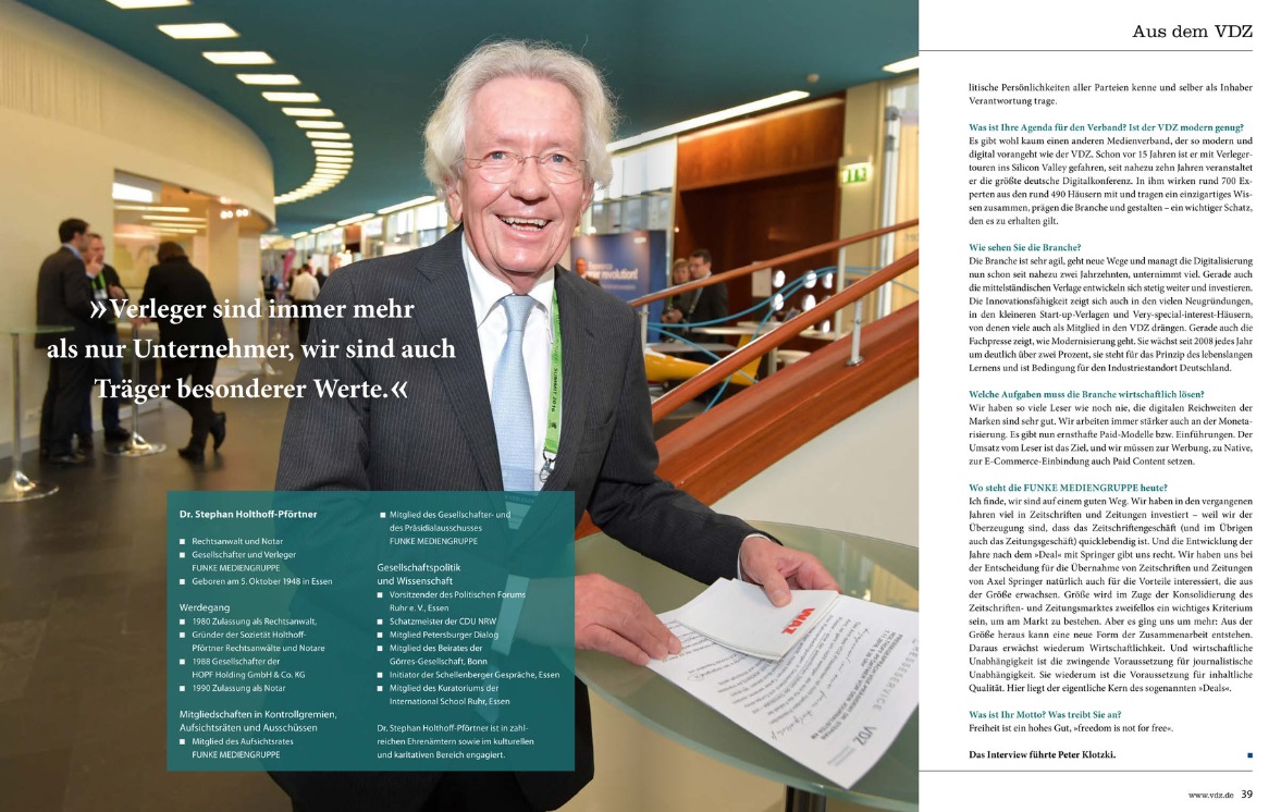 Pressefreiheit setzt immer auch unternehmerische Freiheit voraus. Der freieste Journalist ist immer der, der von seinen Lesern lebt. Deshalb bin ich entschieden gegen weitere öffentlich finanzierte und damit auch mitbestimmte Medien. Die Antwort auf die Herausforderungen gerade der Digitalisierung können nicht öffentliche Auffanglösungen sein. Was wir brauchen, ist eine konsequentere Politik, die den Lippenbekenntnissen endlich mehr faire Wettbewerbsbedingungen folgen lässt. Mir ist es wichtig, einen noch intensiveren Dialog mit der Politik zu führen. Ganz zentral ist für mich der Zusammenhang zwischen wirtschaftlich frei agierenden Verlagen und Pressefreiheit. Das gehört untrennbar zusammen. Wissen Sie, ich glaube an unsere Branche und ihre Möglichkeiten. Ich will die einzigartige Zeitschriftenkultur erhalten, das Zusammenspiel von Großen und Kleinen, von Publikums-, Fach- und konfessioneller Presse in einem fairen Wettbewerbsumfeld. Das ist es, was Innovation ermöglicht. Ich bin davon überzeugt, dass es meiner Arbeit an der Spitze des VDZ hilft, dass ich nicht politikfern bin, sondern politische Prozesse und politische Persönlichkeiten aller Parteien kenne und selber als Inhaber Verantwortung trage.