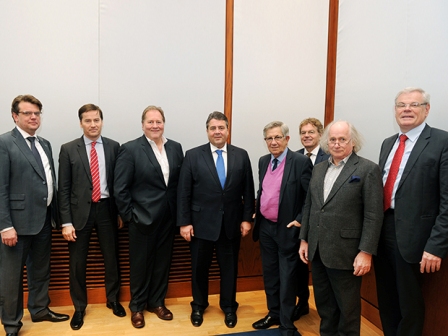 Bundesminister Sigmar Gabriel (4.v.l.) mit Heiko Wiese (SPIO), Stephan Scherzer (VDZ), Prof. Dieter Gorny (BVMI), Juergen Doetz (VPRT), Alexander Skipis (BOEV), Dr. Knut Boeser (VDD), Helmut Heinen (BDZV) (v.l.n.r.) © BMWi/Susanne Eriksson