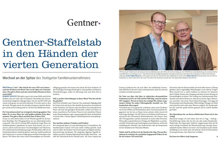 1979 trat Erwin Fidelis Reisch als Assistent der Geschäftsleitung in den Alfons W. Gentner Verlag ein. Seit 1983 führte er das Medienhaus als verantwortlicher Geschäftsführer und Verleger. Zum 1. Mai 2020 wurde der langjährig geplante Generationswechsel an der Spitze des Stuttgarter Familienunternehmens vollzogen: Erwin Fidelis Reisch (65, rechts im Bild) gab nach fast vier Jahrzehnten den Staffelstab an seinen Sohn Robert Reisch (37, links) weiter, der seit 2013 im Verlag aktiv ist. Damit übernimmt die vierte Generation die Verantwortung für das 1927 gegründete Medienunternehmen.