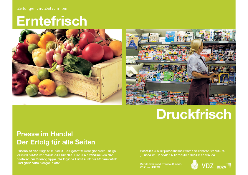Tägliche Frische und starke Markenvielfalt aus einer Hand – der Bundesverband Presse-Grosso e.V. wirbt in einer Anzeigenkampagne für die Vorzüge von Zeitungen und Zeitschriften im stationären Handel. Kooperationspartner sind der Verband Deutscher Zeitschriftenverleger e.V. und der Bundesverband Deutscher Zeitungsverleger e.V.