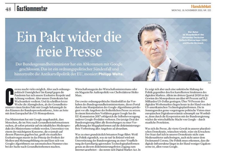 Der zweite ordnungspolitische Sündenfall ist das Vorhaben des Bundesgesundheitsministeriums, dieses Portal durch eine Manipulation des Google-Algorithmus' privilegiert vor alle Angebote der freiheitlichen Presse zu setzen. In einem historischen Verfahren gegen Google hat die EU-Kommission 2017 erfolgreich die Selbstbevorzugung anderer Google-Produkte verboten. Der jetzige Deal der Bundesregierung führt alle Bestrebungen zu einer Verpflichtung der Megaplattformen auf die diskriminierungsfreie Verbreitung aller Angebote ad absurdum.