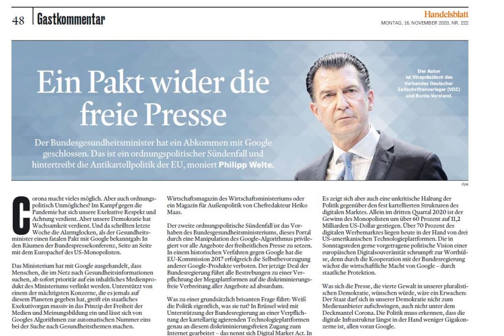 Gastkommentar erschienen im Handelsblatt vom 16.11.2020: Philipp Welte, Vizepräsident des Verbandes Deutscher Zeitschriftenverleger (VDZ) und Burda-Vorstand über das Abkommen des Bundesgesundheitsministeriums mit Google.