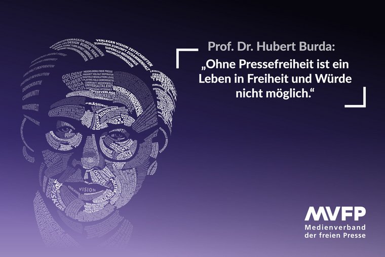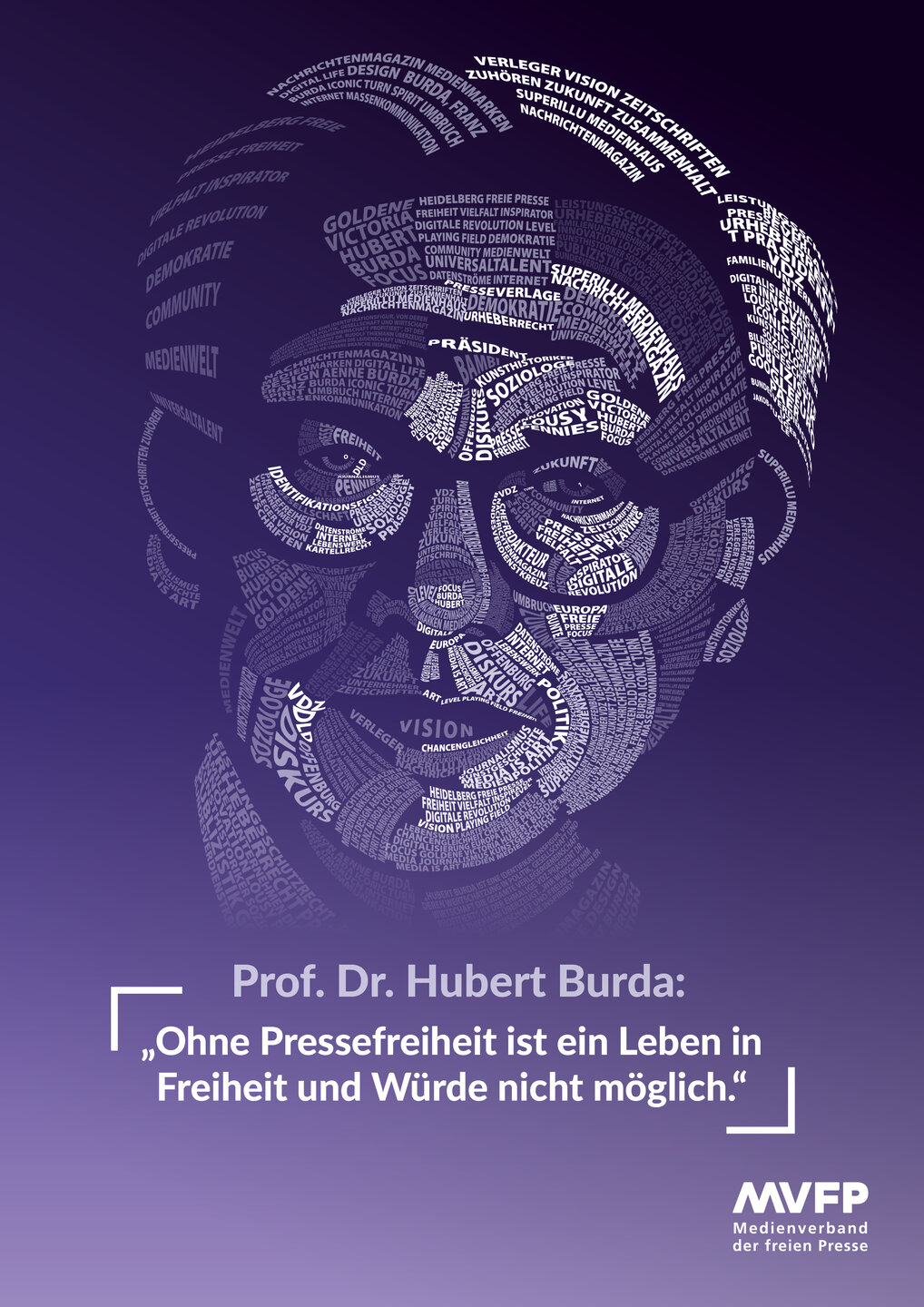 Hubert Burdas Spürsinn für gesellschaftlichen und technologischen Wandel hat auch die Verlagsbranche nachhaltig verändert. Er ist nicht nur ein erfolgreicher Verleger, sondern auch ein engagierter Verfechter der freien Presse. Als Präsident des Verbandes Deutscher Zeitschriftenverleger (VDZ), dem heutigen MVFP, prägte er den Verband über fast zwei Jahrzehnte und formte ihn zu einer schlagkräftigen Organisation, die national und international hohes Ansehen genießt. Zu den Meilensteinen unter seiner Führung zählen unter anderem das 2013 vom Bundestag verabschiedete Leistungsschutzrecht für Presseverlage – ein wegweisender Erfolg für die freie Presse –, der 2014 verhinderte Kompromiss zwischen Google und der EU-Kommission im Kartellverfahren zum Marktmissbrauch des Suchmonopols sowie sein Engagement für die 2008 mitbegründete Deutschlandstiftung Integration. 2016 würdigten die Zeitschriftenverleger ihren langjährigen Präsidenten mit der „Goldenen Victoria“ als Vordenker und Inspirator der Zeitschriftenbranche.